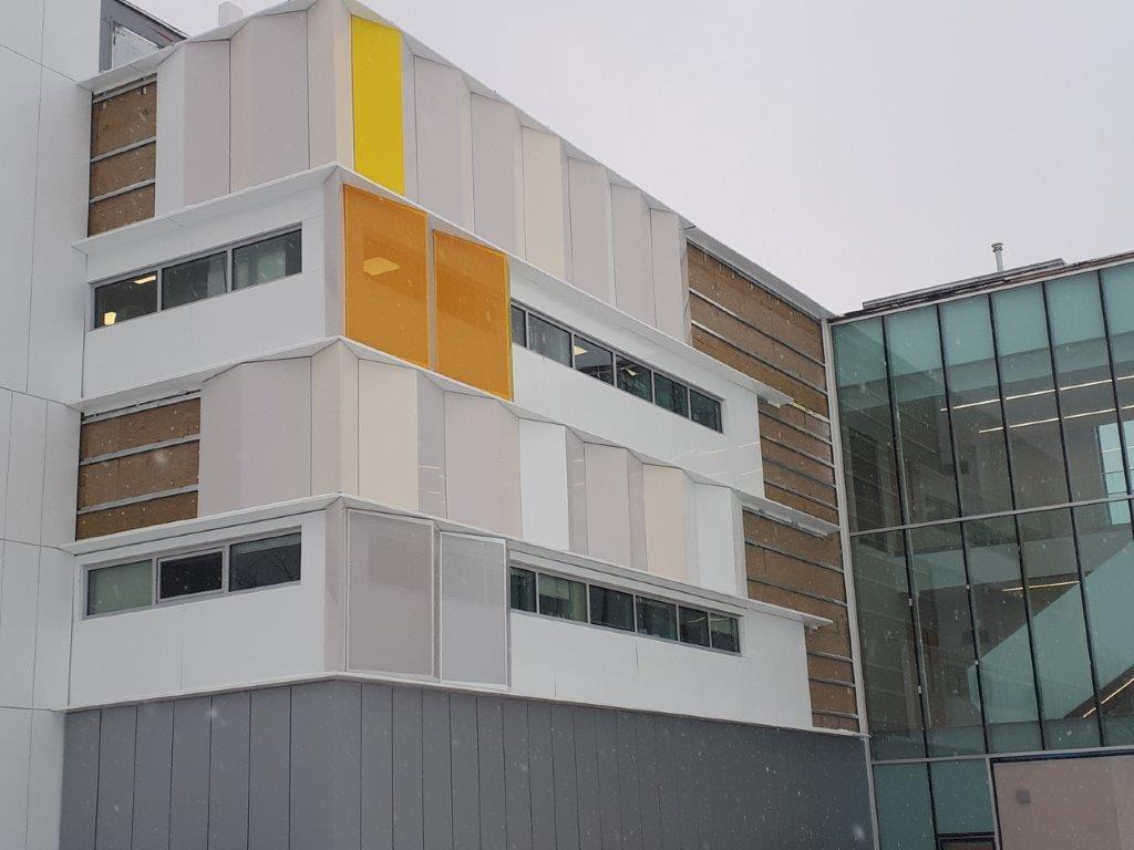 Revitalized the outdated A-Wing Building which serves as the campus gateway. Complete interior and exterior facelift of 3 Storey building including new stairwell addition. Renovations to create and update spaces for use as classrooms, updated labs, faculty spaces, new washroom facilities, modernized corridors including new glass partitions. Exterior renovations included a complete new exterior wall assembly and cladding systems using Alpolic Aluminum Panels updating the exterior to a newer modern look.