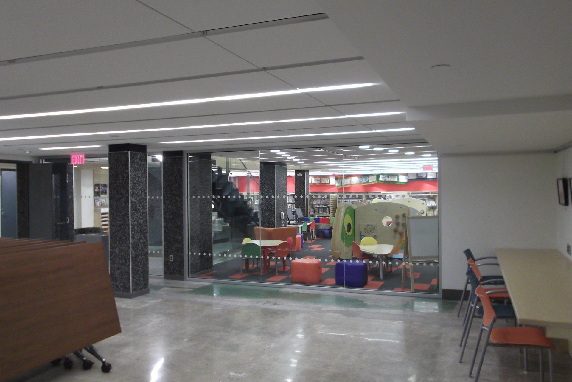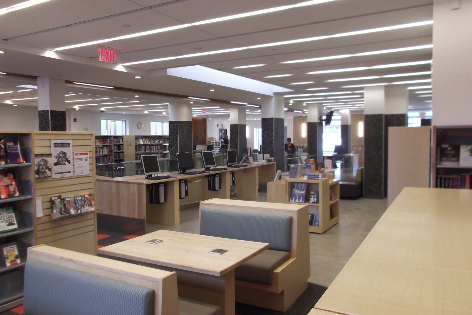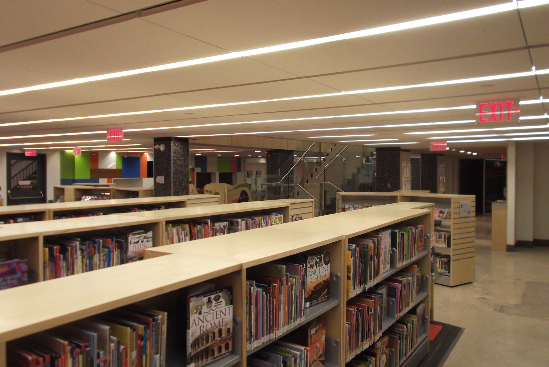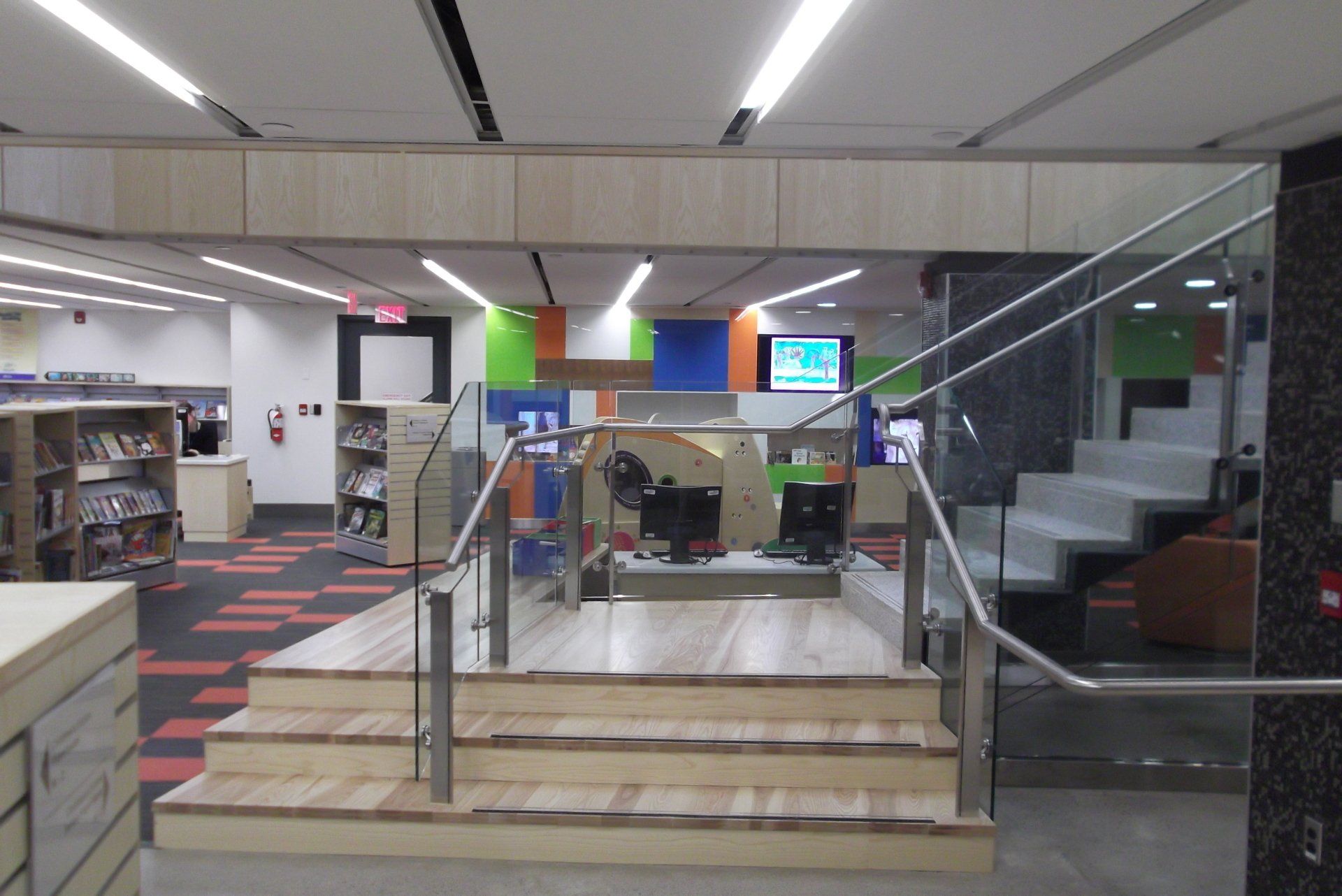 Complete Interior Renovation, Expansion & Exterior Alterations of Library Branch located in busy urban area of Toronto. **2013 - Award of Excellence - Toronto Urban Design Awards. Main and Lower level changes including major structural, Mechanical and Electrical changes. The project includes a new front façade of Metal Siding, a feature stair connecting the main and lower level as well as a new elevator. Expansion of the existing building to create new spaces as well as to create new outdoor space. Some of the new spaces created include children’s reading centres, computer area, AV Rooms, quiet reading spaces including stone and steel veneer fireplace, Meeting rooms and Lecture Halls. The spaces were created with Drywall partitions and Aluminum framed curtain walls. The outdoor space created includes outdoor furnishings, landscaping, Metal Siding and